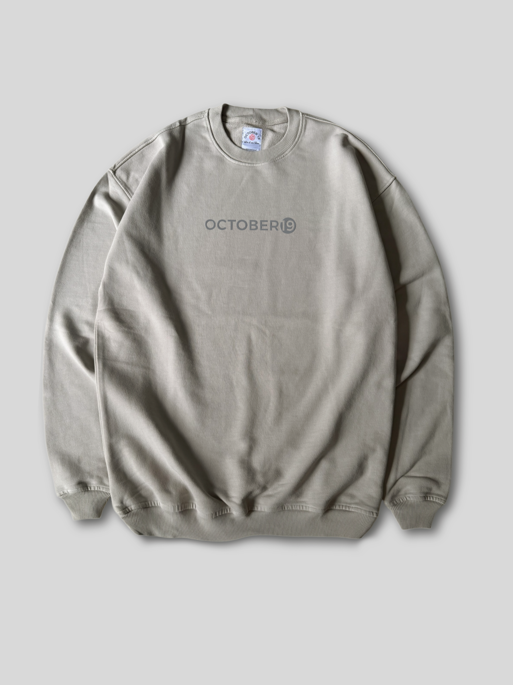 The OCTOBER19 crewneck is made of 375g/m² coarse cotton fabric and features a half-relief print on the chest.