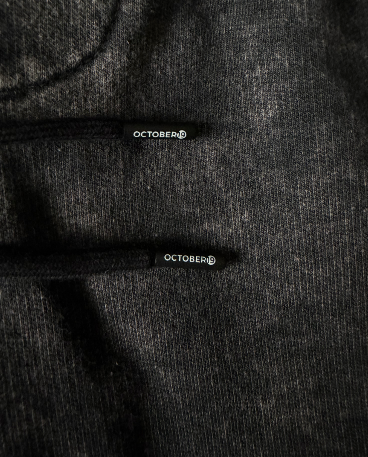 The OCTOBER19 shorts are made from 375g/m² coarse fabric with an aged finish. They have a back pocket and drawstring with logo, and a half- relief print on the lower front.